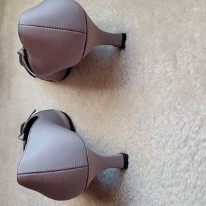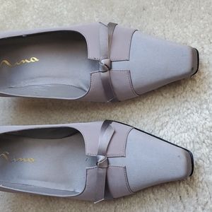 Gray women shoes. Worn a few times. Low 1" heal. It has a few marks on the toe but still have a few lives in then. See pic 1 and 5. Fabric outer lining. Very comfortable. Still in the original box.