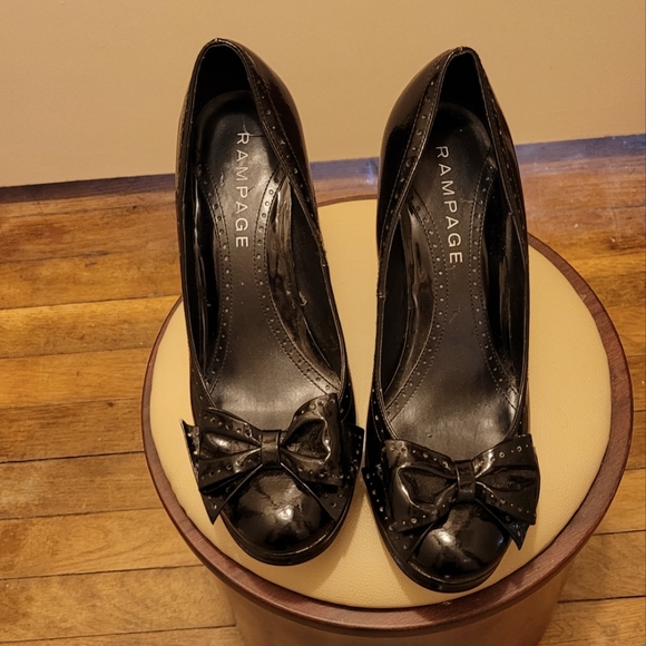 Rampage black patent leather pumps with thick bow in front. Has edged out poka dot design border trim on shoe and bow. little thicker heel for stability.