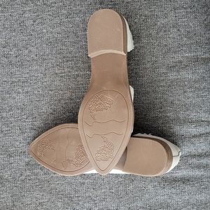 Suede Material shoes with a very short heel. Worn one time. Color (as shown on tag) is attractive light blue.