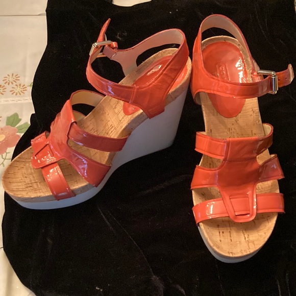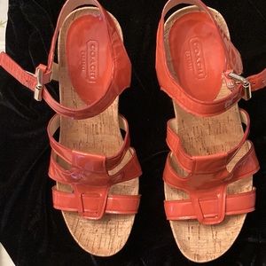 Orange patent leather Coach 4 “heel wedgies with cork like insole with gold hardware