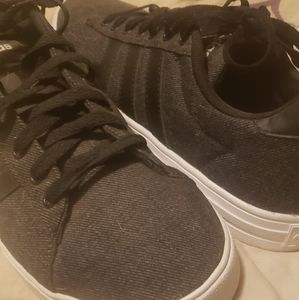 These are Adidas shoes. They are a dark gray, practically black fabric low top shoe.