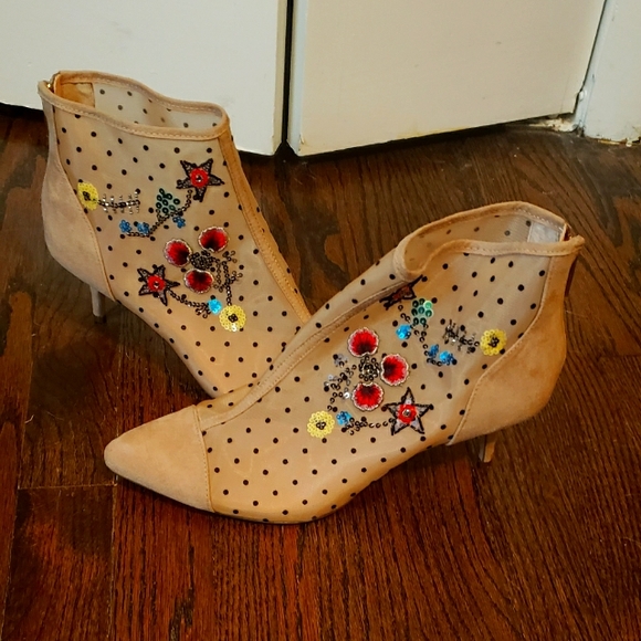 These are tan low heeled shoes with flowers on them.