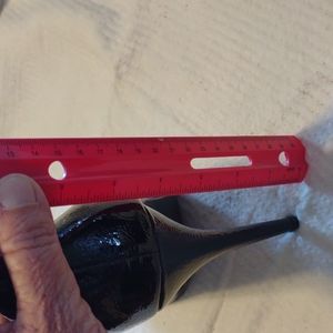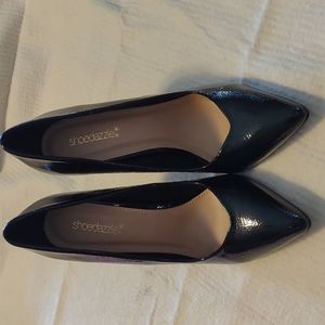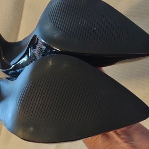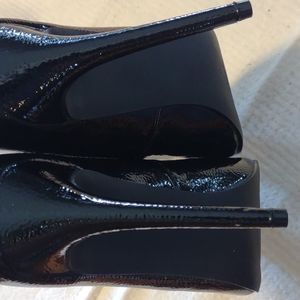 textured patent leather, black. 4 1/2 in heels. shoe dazzle