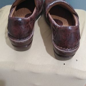 dark brown and light brown embossed shoes man-made material light wear on back heels