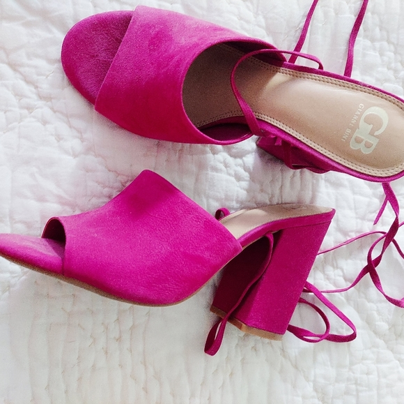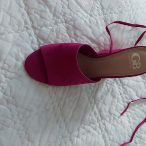 GB pink suede heels with wrap ties at ankles. worn only 1 time. Like new condition