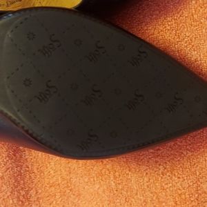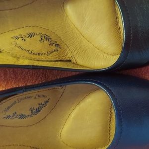 black leather mid heel, 2 1/2 heel. shoes are lined with leather insole. worn 1 time. no scuffs. great condition.