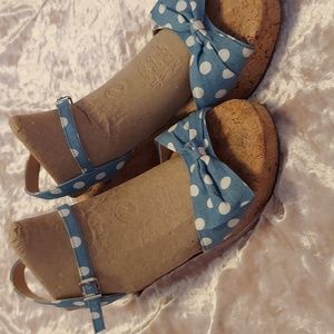 blue and white polka dot cork bottom sandles. height is 3 inches. clean, no scrapes, holes or stains. so fun to wear, they were worn 4 or 5 times, I broke my ankle, not wearing these shoes, and can only wear flats.