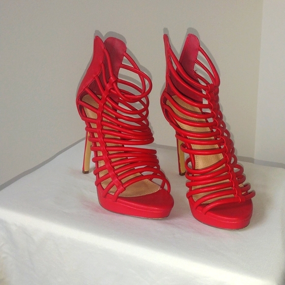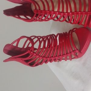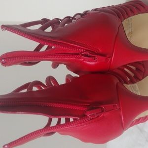 red strap sandals with adjustable front strap in the front or on the side.