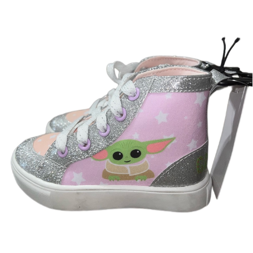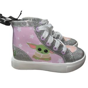 Calling all toddlers! This hightop is outlined with silver glitter and features Grogu on the side. Perfect for any toddler whos a fan!