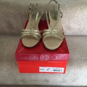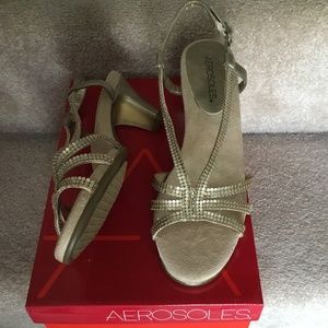 2 inch Aerosoles open toes dress shoes, never worn. Color is soft gold
