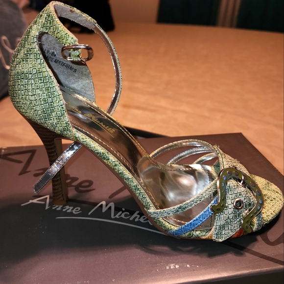 Green snakeskin heels with buckle design, never worn