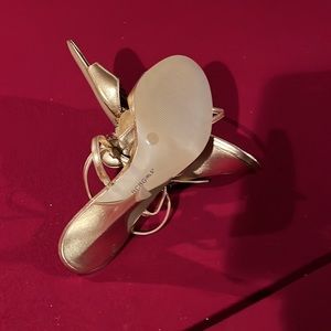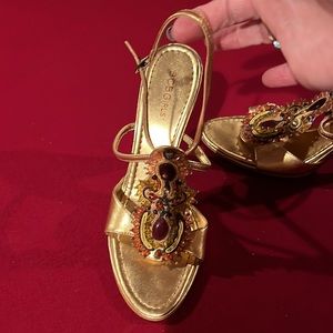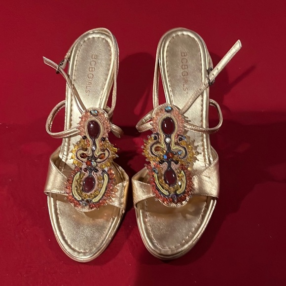Beautiful BCBG gold ankle strap pumps with beautiful beaded details on the front brand new never worn