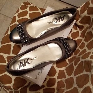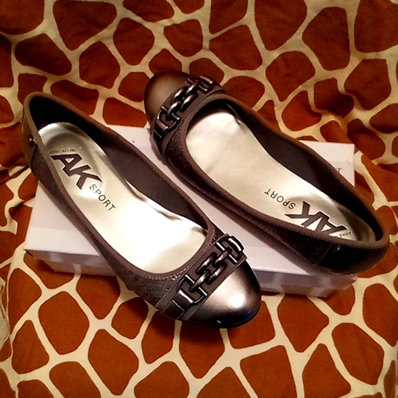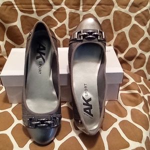 These shoes are not only cute and stylish but comfy as well. There are unique buckles at the top, color is pewter with snake skin accents on the sides, nice low rubber heel and sole with heel cushion on the inside worn only once on carpet by AK sport