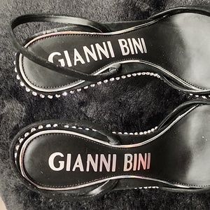 Gianni Bini black satin rhinestone embellished slip on heels.