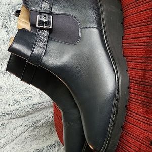 navy blue leather water-resistant ankle boots.