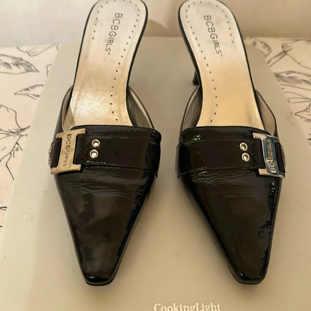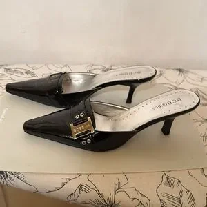 Black patent mule w/silver-tone buckle accent. Heels approx. 2”. Never worn.
