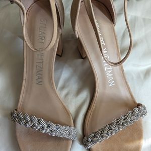 This elegant outgoing shoes, made by Stuart Weitzman with rhinestones across the front of the shoe and around the buckle, brand new never been worn with small spots. Size 7 cream.