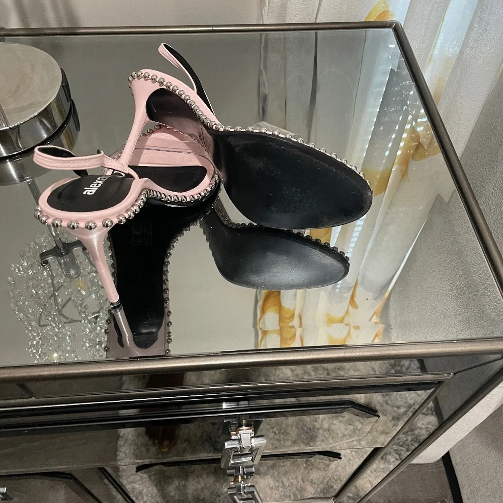 Wore once, Sling back with a clear strap across toes giving it a barely dare look accompanied with sliver studs around the sole.