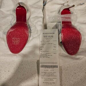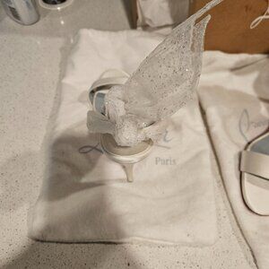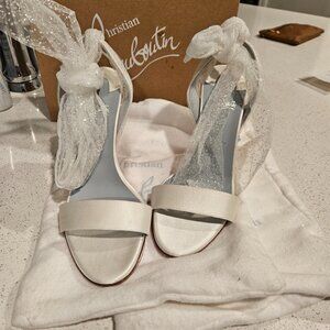 Sandals du Desert, limited edition white satin heels with rhinestone mesh that wraps around ankle, size 41, condition new, never worn. Still have garment bags and shoe box