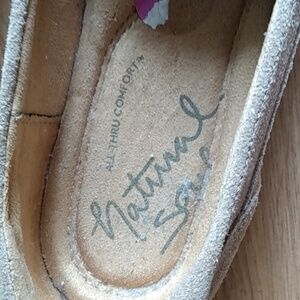comfortable Naturalizer loafers with details at top looks like weaving., natural suede. low cushion soles . natural soul..by Naturalizer. Sz 8.5 M taupe. new never worn these are a tan color not grey as the picture..