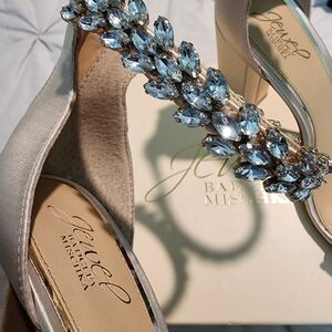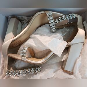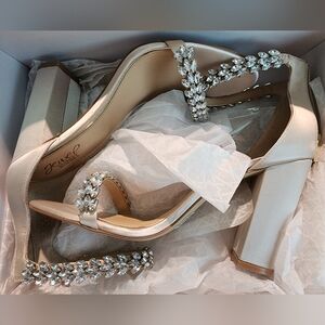 Heels satin strap. Cream color. Jewels on ankle strap and toe. Block heels 4in. Size 10. Worn once for wedding.