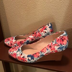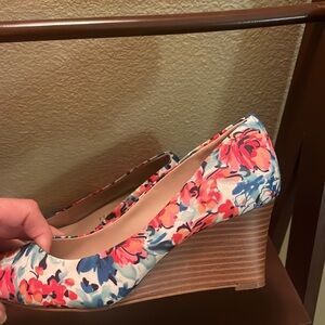 Beautiful floral wedged heel shoe slightly rounded toe. Lovely paired with jeans or a dress outfit. So cute.