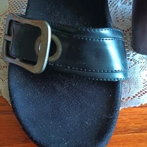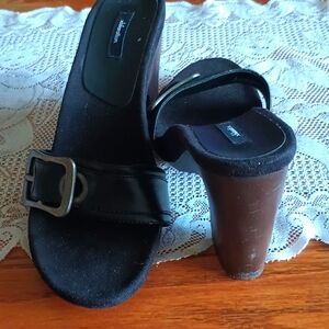 Vintage black slide on heels with leather and gold buckle to adjust for width and 4 inch heels good condition