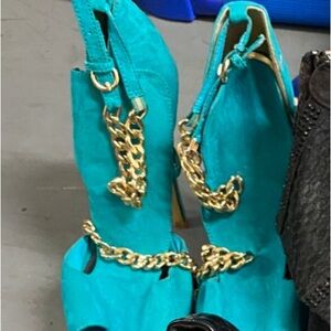 Charming Gold Chains Decorated Sandals Peep Toe Turquoise Suede High Platform Stiletto Heel Dress 👗 Pumps
