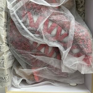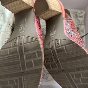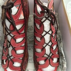 Leather salmon color lace up sandal in great condition avout 2in heel original box worn only once