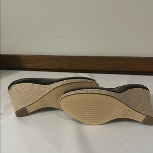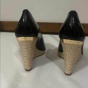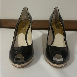 Black patent leather, open toe, Michael Kors Shoes, rope materials on sole and back, , approx 4 inch heels, never worn, with a M Kors box but not the original