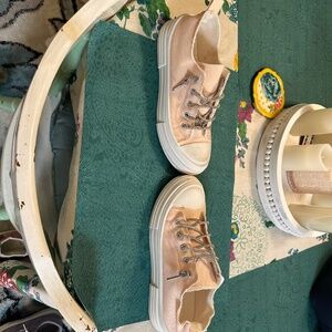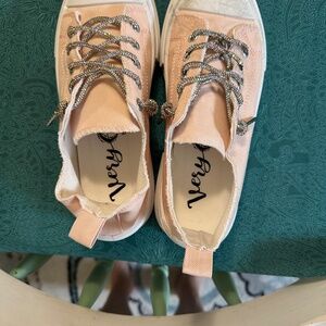 Very G size 8 pink canvas shoe with white accents and sparkly rose gold laces.