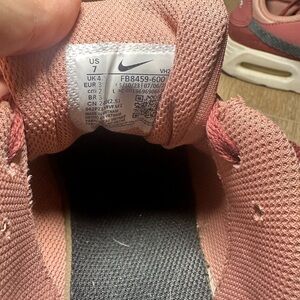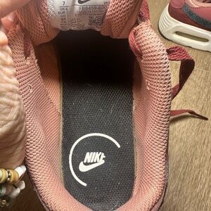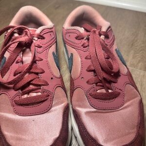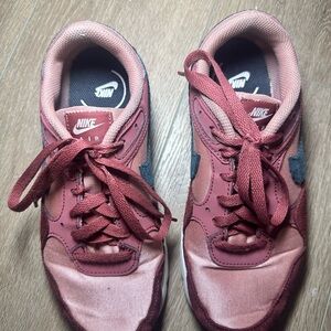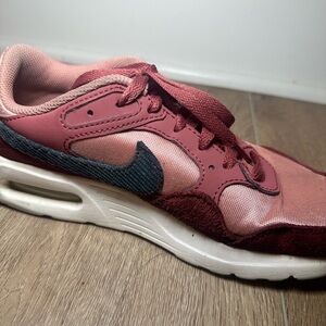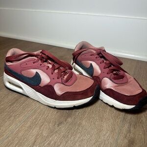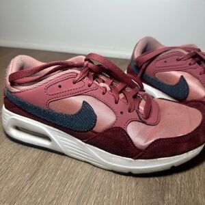Nike Air Max SC sneakers in women’s size 7. Style code FB8459-600. Pre-owned and in good condition with normal light wear from use. Features a beautiful burgundy and dusty rose pink colorway with dark grey Nike Swoosh accents. Constructed with mixed materials including mesh textile, suede overlays, and synthetic leather. Classic visible Air Max cushioning in the heel for comfort and everyday wear. Lace-up closure with padded collar. Rubber outsole for durability. Clean interior and solid structure. Please review all photos for condition details prior to purchase.