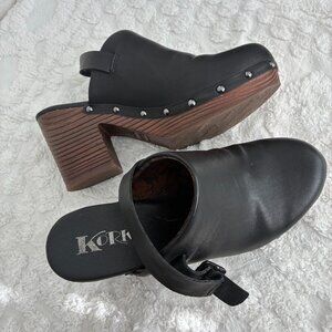 Round studs accent around the midsole of this wooden platform clog for a sleek and refined style.