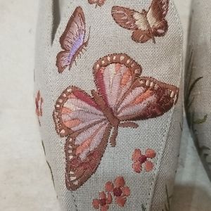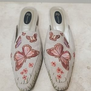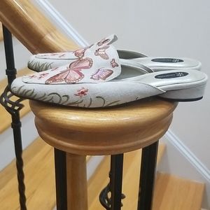 These mules are a stylish design selection from the NY Fashion Week inventory. The fabric upper has beautifully stitched butterflies, small flowers and a touch of green grass. Comfort padding on the heels. The sizing is 7 1/2 (European "38"). They were never worn and are in excellent condition.