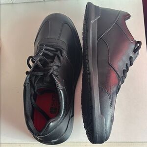 Work shoes for women or men. Slip resistant work shoes. Experience the perfect blend of style and functionality with these black Oxfords from Shoes For Crews. Crafted with a smooth leather-like finish, these shoes offer a minimalist and sleek design ideal for both formal and casual occasions. The rounded toe and matching laces add a touch of elegance to your footwear collection. 8 for men and 91/2 for women.