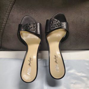 Elevate your style with these black leather pumps from Allen Schwartz's Dalila collection. These slip-on heels feature a comfortable block heel and cushioned insole designed to keep you on your feet all day. The open-toe design and solid pattern make them versatile enough to wear with any outfit. These shoes are perfect for any occasion, from a day at the office to a night out on the town. Add these stylish and classic pumps to your wardrobe today! Excellent condition. No real signs of wear, not even on the bottom. Heels measure 3" - 4".