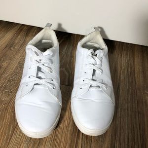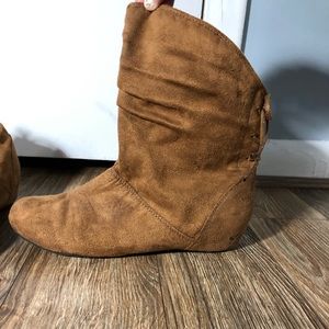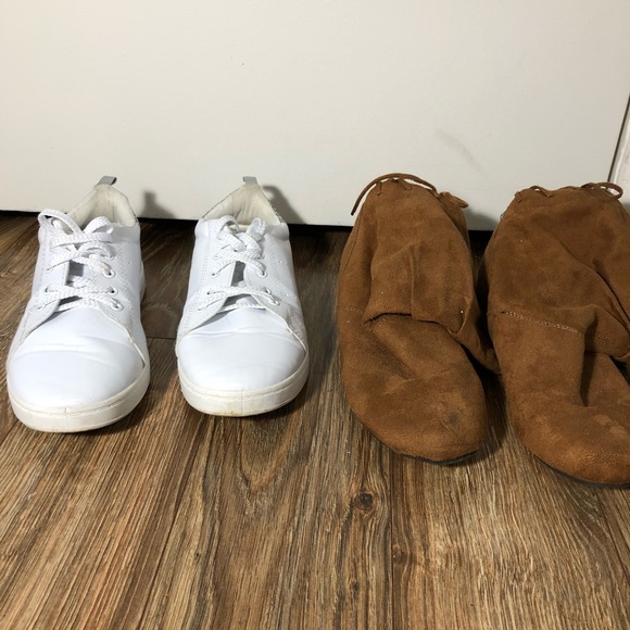 Two pair of used women’s size 8 shoes Worn White and glitter sneakers Brown suede boots in good condition