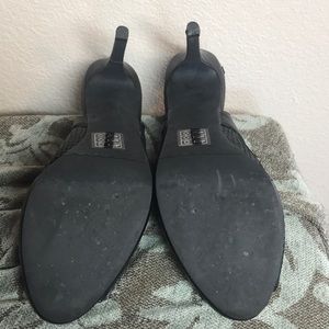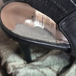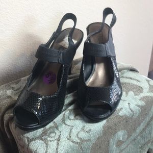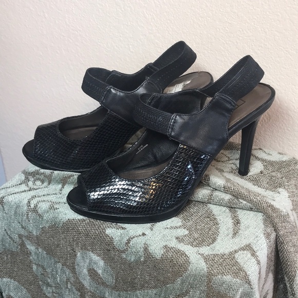 EUC Size 6 1/2 like new black vegan leather & vegan snakeskin. Sling backs with stretchy elastic strap across front. 3 1/2” heels. Some of inside liner came off see pic