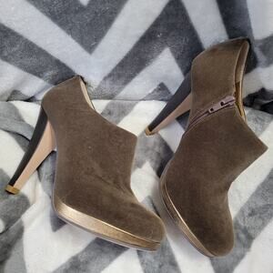 Shoes of Prey Custom Suede Velvet Olive Green & Gold Heeled Zip Up Booties Sz 37