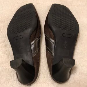 Brown suede lined clogs, 2 1/2 inch heels, very comfortable.