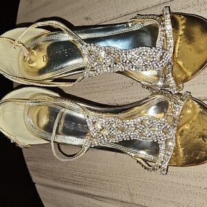 Shoes- evening, with gold straps, very high heels.
