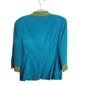 Shomi By Millie Shor Torquoise Chartreuse Silk Lightweight Jacket Size 8. Pit to pit 20", shoulder to hem 25", Shoulder Pads, Color Block, 3/4 Sleeve, Covered Button Closure. Like New Condition, Pre-Owned