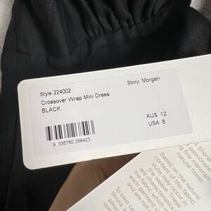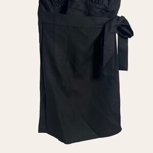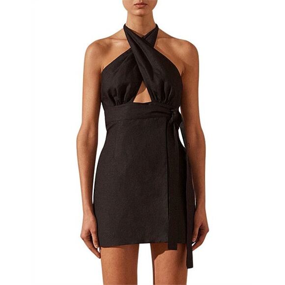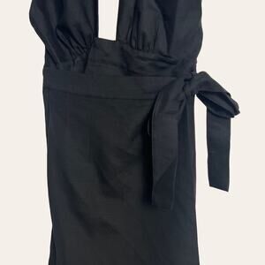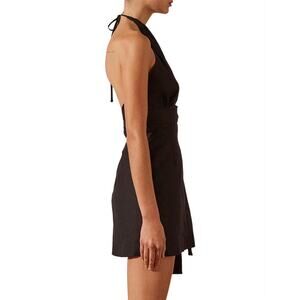 Elegant black mini dress. Halter neck design. Wrap tie detail. Perfect for evening wear.
