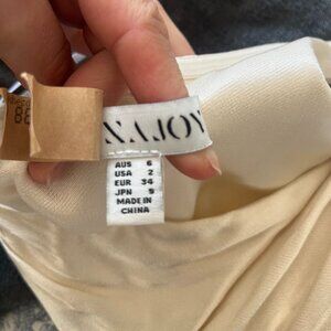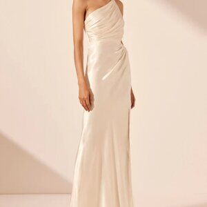 This stunning cream gown by Shona Joy features a sophisticated one-shoulder neckline and elegant ruching that adds texture and dimension. The asymmetrical design and thigh-high slit create a dramatic silhouette, perfect for wedding guests or cocktail events.