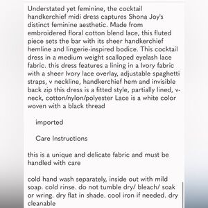 Lace overlay, lace handkerchief hemline not lined, adjustable straps, back zip