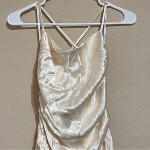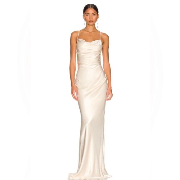 Elegant cream maxi dress by Shona Joy. Features a sleek silhouette and delicate straps. Perfect for formal occasions.