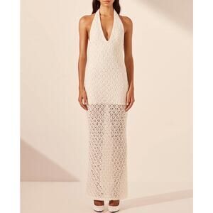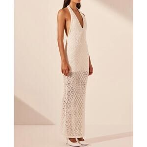 Shona Joy dress, crochet halter dress, beach wedding guest, open back gown, backless dress, ivory maxi dress, resortwear, summer formal, romantic minimalist, vacation outfit