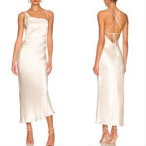 Shona Joy La Lune Asymmetrical Bias Cowl Midi Dress in Cream. Color most like actual photos. Women's Size US 6 / Medium. Features adjustable shoulder straps with lace-up back tie closure, ssymmetric cowl neckline, lustrous satin fabric with ruched detail, fully lined, hidden back zipper closure, long midi maxi length. 58% lenzing ecovero, 42% viscose. Worn once, never altered. Great used condition, no notable flaws. Retail $320.