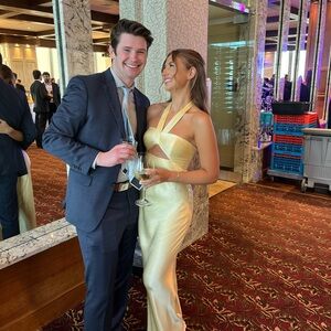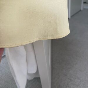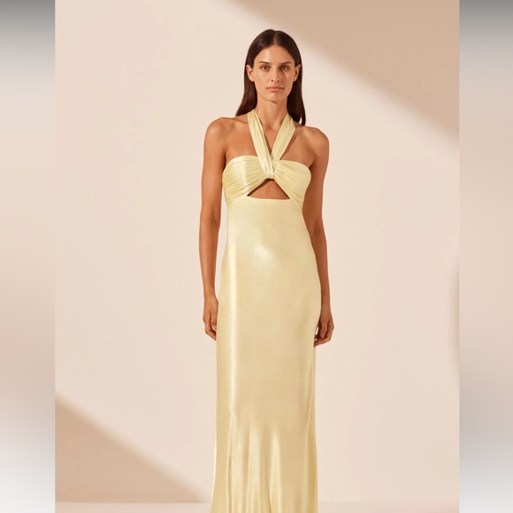 This stunning yellow gown by Shona Joy features a chic cut-out design and a backless silhouette, perfect for prom or cocktail events. The halter neckline and sleeveless style add a modern touch, while the luxurious fabric drapes elegantly to the floor, creating a sophisticated and minimalist look. This dress was just worn once for my friends wedding and is amazing condition! I just had it dry cleaned but has one small mark and the bottom but is not noticeable when on.