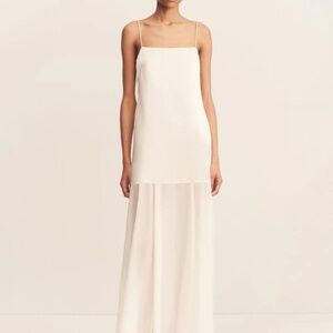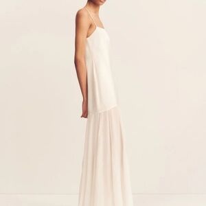 Dropped waist maxi dress in ivory in a luxurious satin acetate contrasted with a light weight semi-sheer georgette.